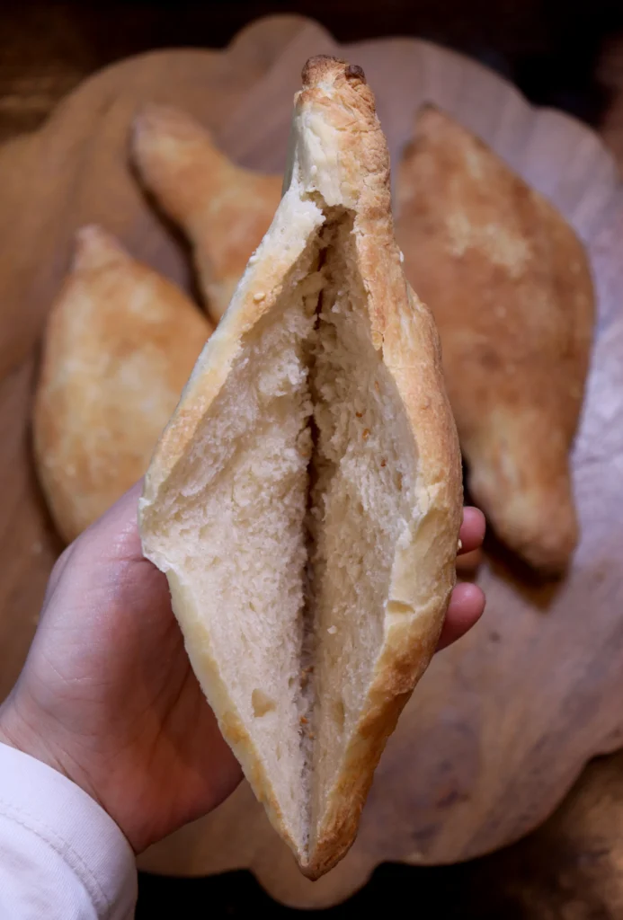 The boat-shaped samoon isn’t just decorative—its pointed ends help the bread bake evenly in very hot traditional bakery ovens. The thicker middle stays soft and fluffy while the ends crisp slightly. Many Iraqis even use the pointed tip as a natural “handle” when eating shawarma or falafel sandwiches.
